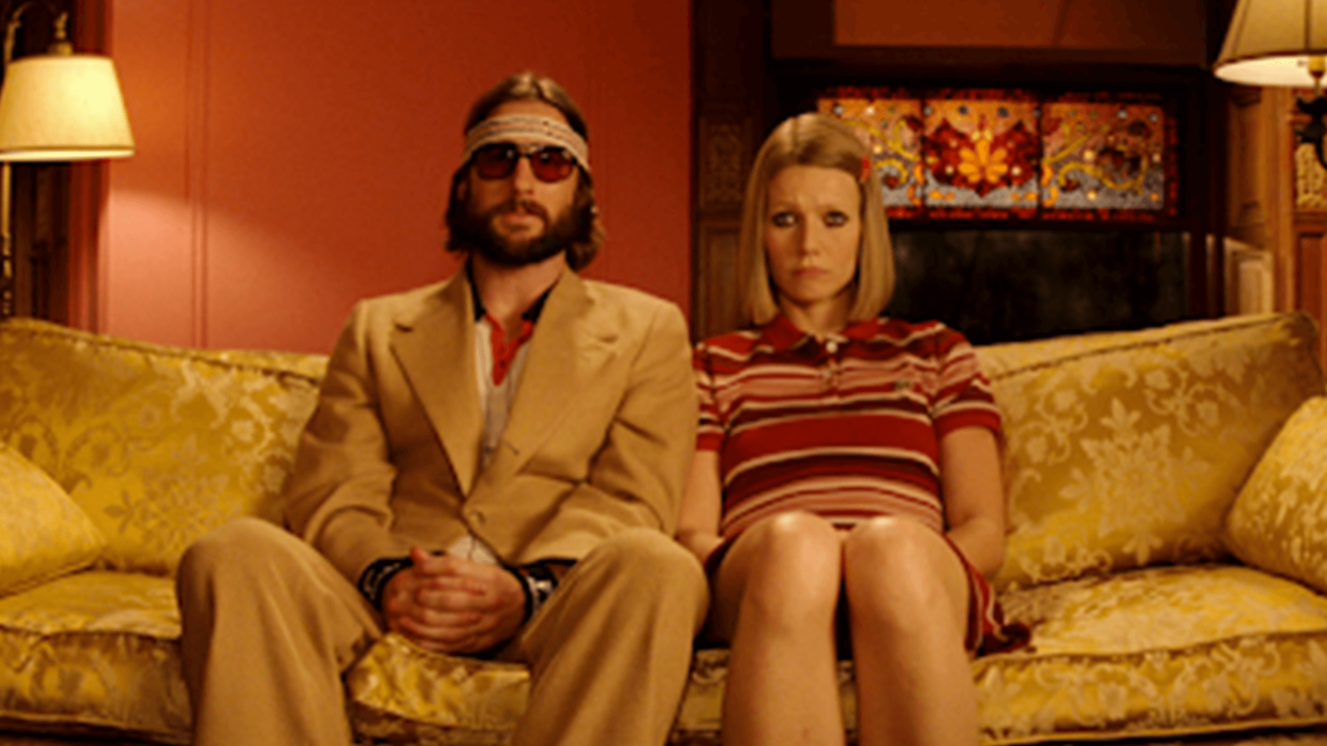 This frame has a consistent colour palette of rustic, warm, red-brown hues. The gold and yellow of the suit and sofa balance out the red walls. The couch, bookcase and lamp placement are nearly symmetrical. The two characters – Richie and Margot Tenenbaum – are seated at the centre of the frame, creating a visually pleasing and satisfying shot.